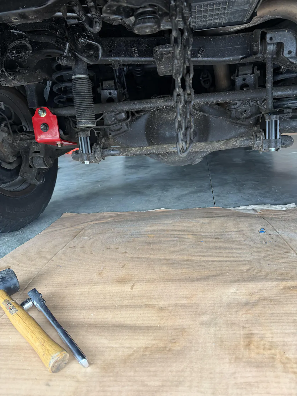 2. Measure from the ground to the center of the frame-side track-bar bolt.